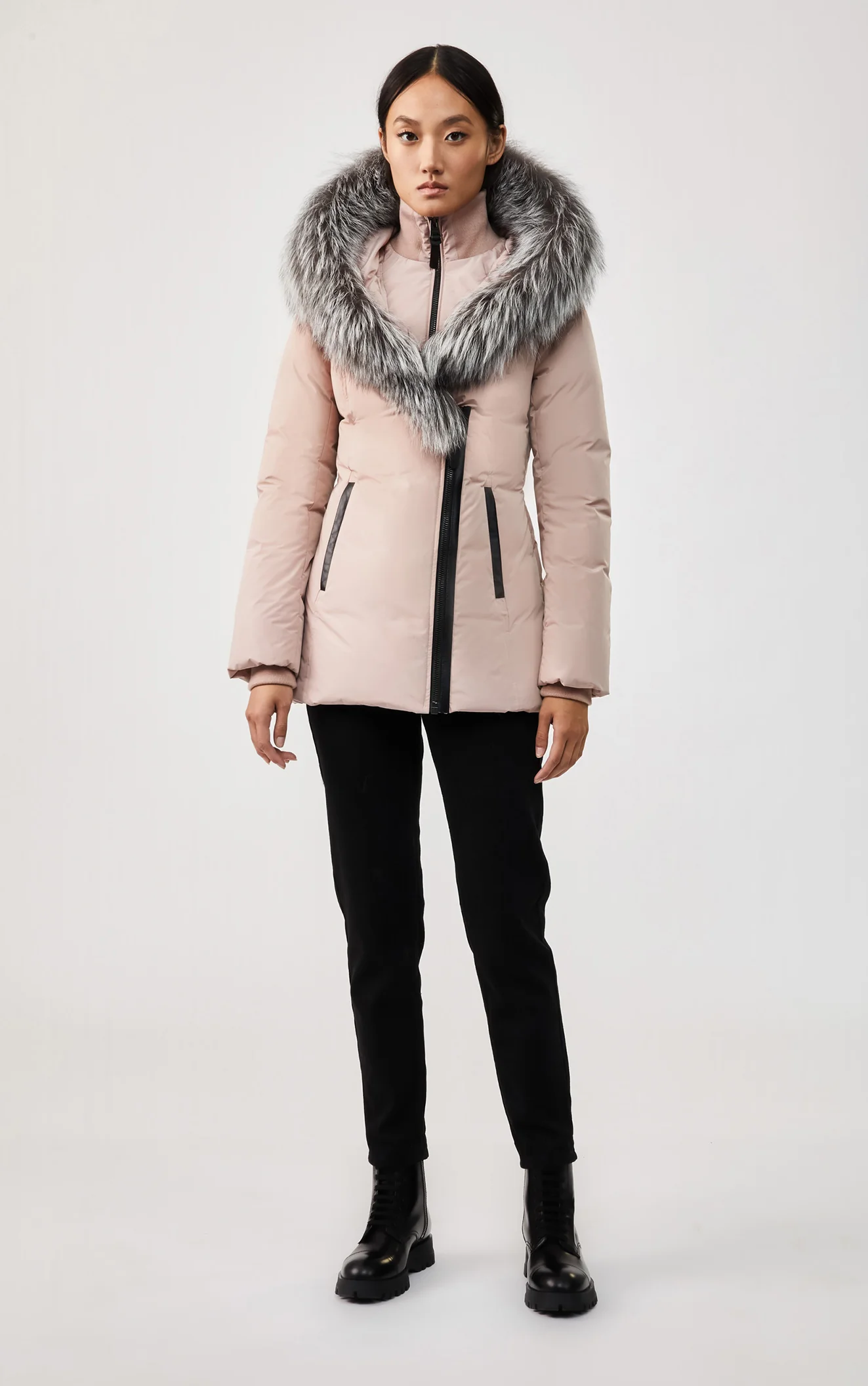 ADALI-X is a recycled down coat for women featuring our Signature Collar with silver fox fur and an asymmetrical zip closure. Lab tested to protect with weight-to-protection ratio, it has an inner bib with rib collar, hidden hood toggle, and storm cuffs. Water resistant, repellent, and windproof, insulated leather welt pockets add warmth and protection. A design-forward winter essential elevated with thoughtful tailoring.