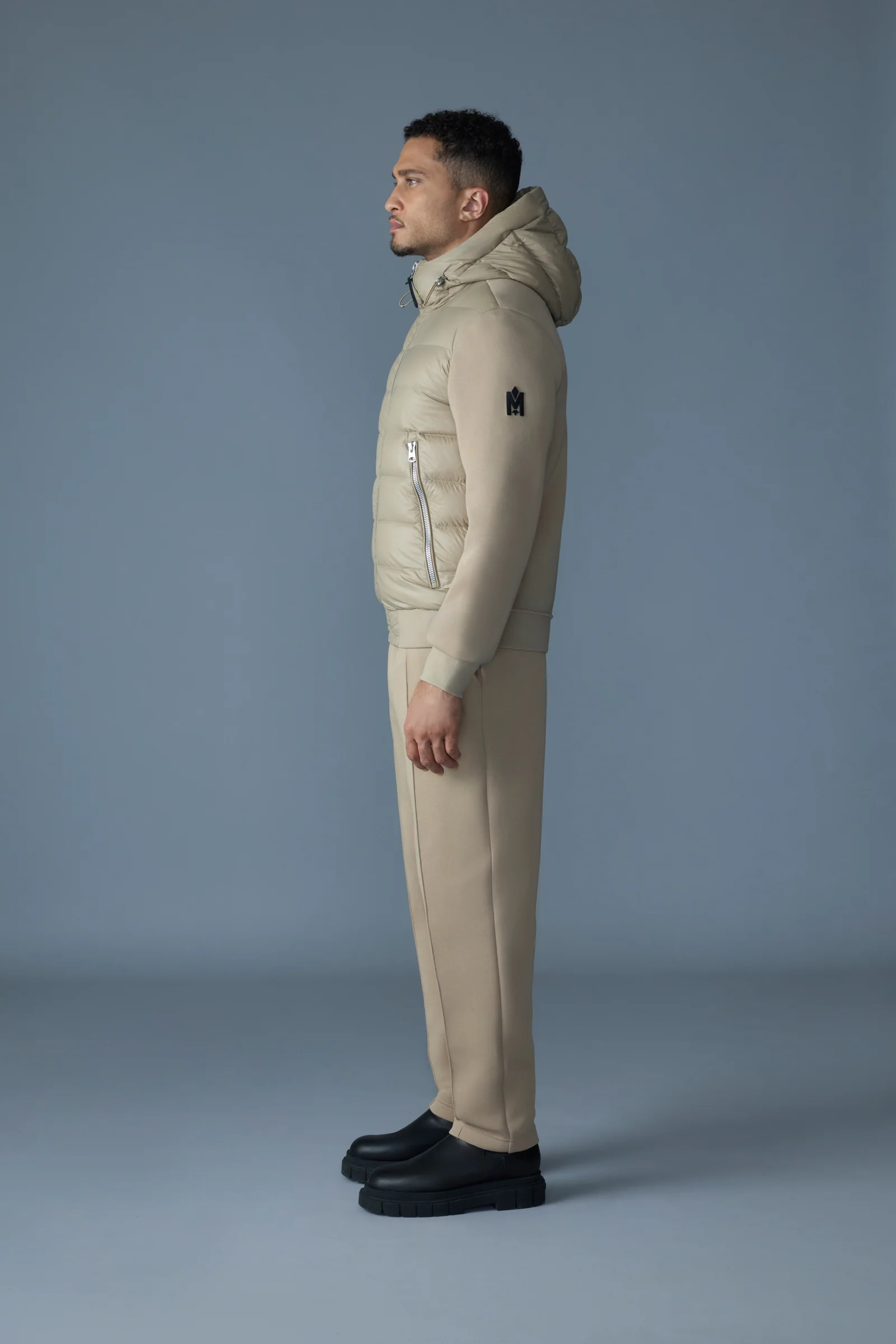 FRANK-R is a mixed-media jacket with an adjustable storm visor hood. The regular-fit bomber silhouette is defined by a recycled lustrous light-down channel quilt front. With indoor-outdoor versatility, the sleeves, shoulders, and back are crafted from a soft double-face jersey. A velvet embroidered signature M adds plush detail.