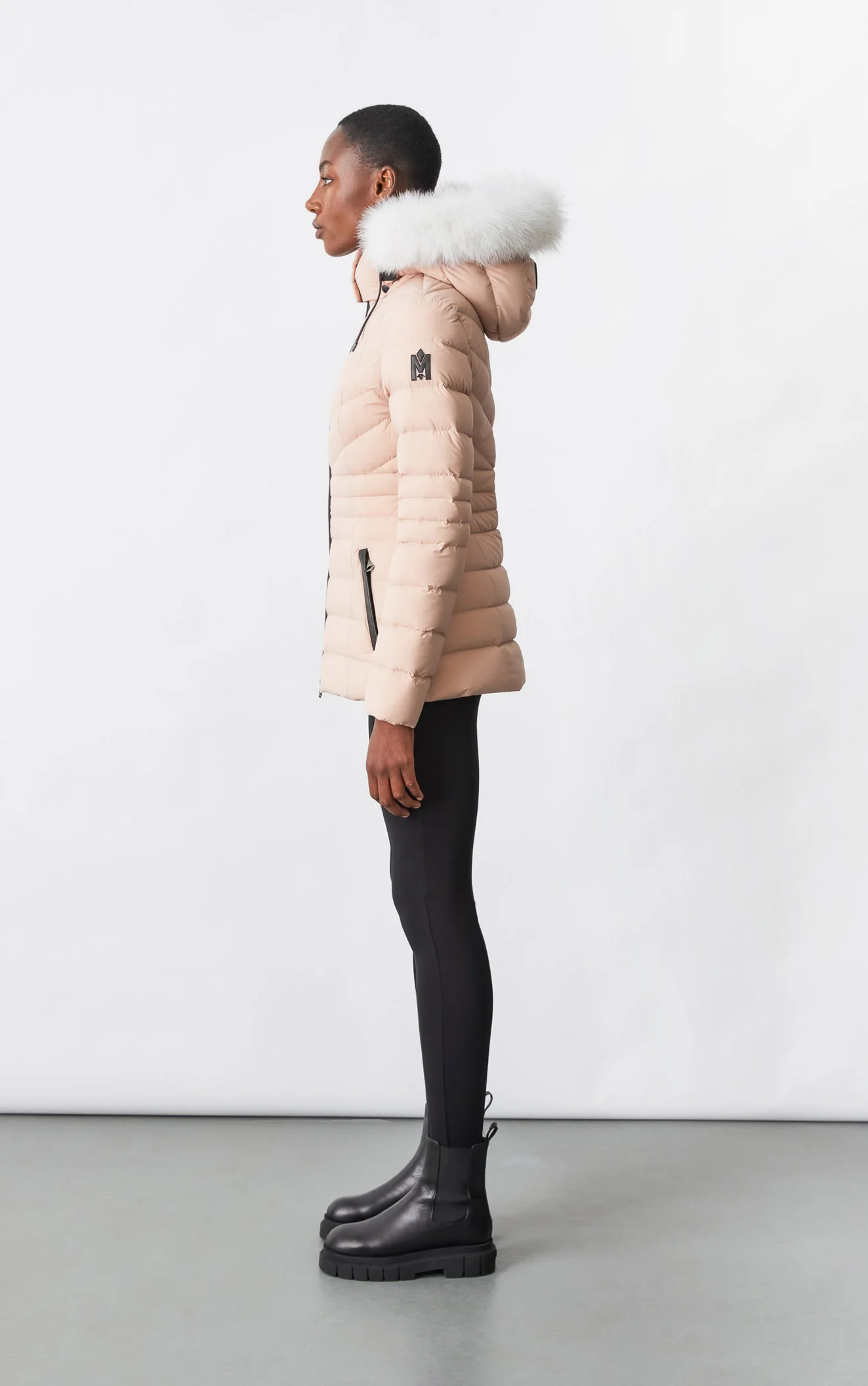 PATSY-BX is a classic mid-length jacket for women meticulously tailored from our proprietary light recycled down and Agile 360 stretch shell. Combining sleek lines with high-performance, the removable hood boasts a plush sustainable blue fox fur trim that can be detached on warmer days. Graphic chevron quilting and sustainable leather detailing accentuate the form-fitting silhouette.